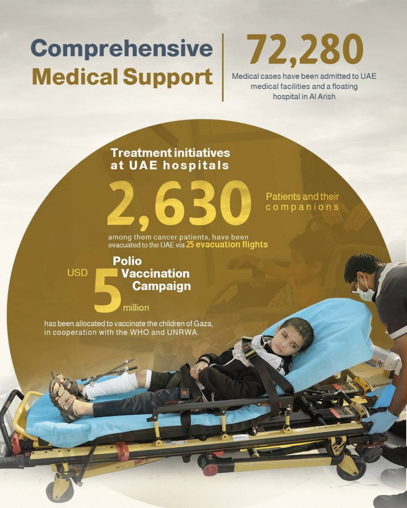 Numerous such victims have been brought to UAE hospitals, where they are being treated with high-quality, free medical care. This initiative demonstrates the nation’s genuine concern for the welfare of those affected the most by the conflict.