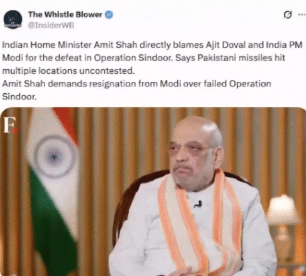 A user named The Whistle Blower posted in English, “Home Minister Amit Shah directly blamed Ajit Doval and Prime Minister Modi for the defeat in Operation Sindoor. He said that Pakistani missiles struck multiple locations without any resistance. Amit Shah demanded Modi’s resignation for the failure of Operation Sindoor.”