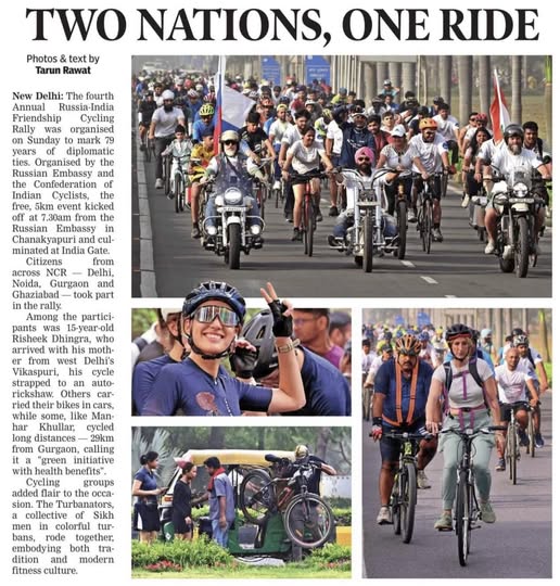 New Delhi, April 20 — A vibrant cycling rally held in the national capital on April 19 commemorated 79 years of diplomatic relations between Russia and India. The event, now in its fourth edition, brought together participants from diverse age groups, including cycling enthusiasts, students, and members of the diplomatic community.