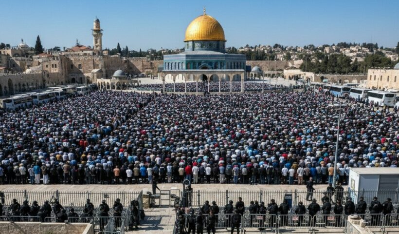 Despite strict restrictions, a massive crowd gathered at Al-Aqsa Mosque, with tens of thousands of worshippers participating on the last Friday of Sha’ban.
