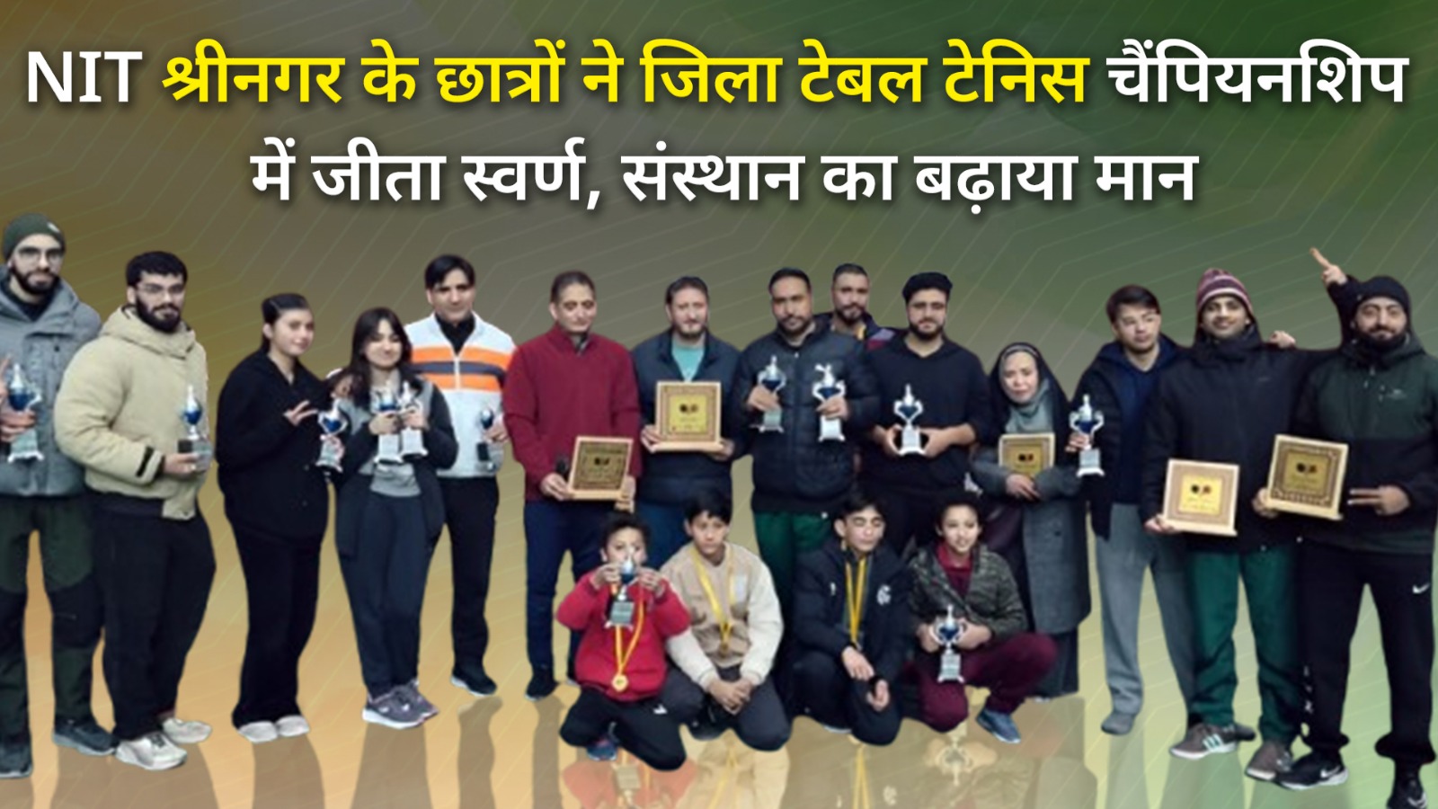 श्रीनगर ज़िला टेबल टेनिस चैंपियनशिप में नेशनल इंस्टीट्यूट ऑफ टेक्नोलॉजी यानी (NIT) श्रीनगर के छात्रों ने शानदार प्रदर्शन करते हुए स्वर्ण पदक अपने नाम किया। यह जानकारी सोशल मीडिया प्लेटफॉर्म X पर (@Kashmir_Positiv) द्वारा साझा की गई है।