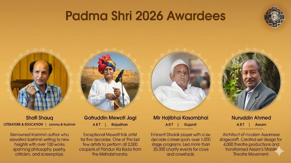 राजस्थान के मेवात क्षेत्र के लोक कलाकार ग़फ़ूरुद्दीन मेवाती जोगी को भी पद्म श्री से सम्मानित किया गया। ‘भीपांग’ और ‘पंदन का कड़ा’ जैसी लगभग विलुप्त हो चुकी लोक परंपराओं को उन्होंने छह दशकों तक जीवित रखा। गांव की चौपाल से लेकर लंदन और पेरिस जैसे अंतरराष्ट्रीय मंचों तक उनकी कला की गूंज सुनाई दी है। यह सम्मान केवल एक कलाकार को नहीं, बल्कि मेवात की लोक संस्कृति और उस साझा विरासत को मिला सम्मान है, जिसमें हिंदू और मुस्लिम परंपराएं एक-दूसरे में घुली-मिली हैं।