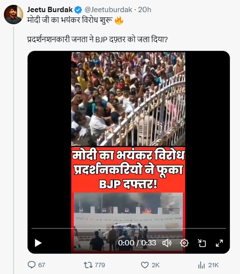 दोनों वीडियो के कोलाज को शेयर करते हुए Jeetu Burdak नामक यूजर ने लिखा, ‘मोदी जी का भयंकर विरोध शुरू. प्रदर्शनशनकारी जनता ने BJP दफ़्तर को जला दिया?