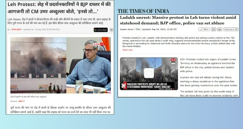 दूसरे वीडियो के स्क्रीनशॉट्स टाइम्स ऑफ इंडिया और एबीपी न्यूज सहित कई मीडिया रिपोर्ट्स में मिले। जानकारी के अनुसार, यह घटना सितंबर 2025 में लद्दाख के लेह क्षेत्र में हुए एक विरोध प्रदर्शन की है, जहां भाजपा कार्यालय में आग लगा दी गई थी।