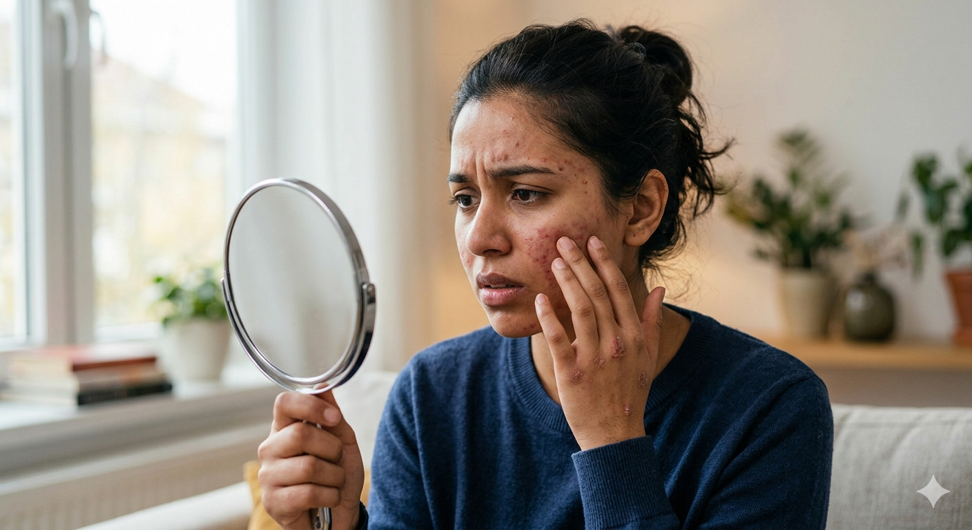 चेहरे पर अचानक मुंहासे, खुजली या त्वचा का बेजान हो जाना… ये सिर्फ़ स्किन प्रॉब्लम नहीं, बल्कि आपके दिमाग़ में चल रहे तनाव का असर भी हो सकता है।