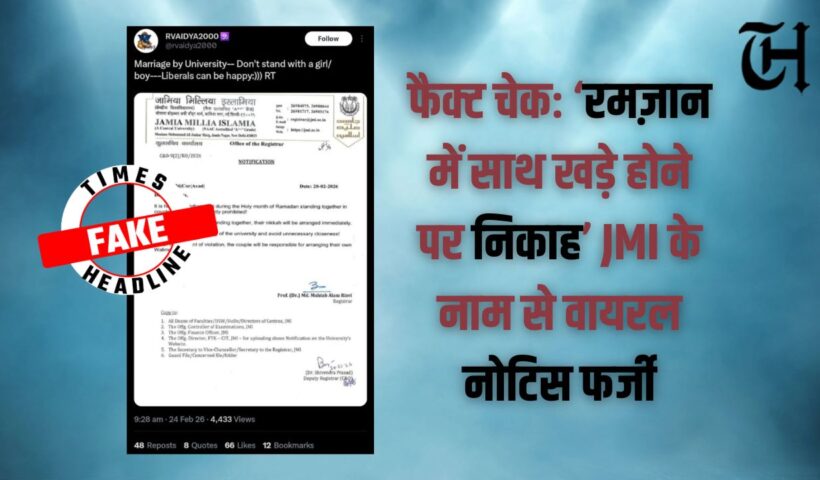 सोशल मीडिया पर इन दिनों जामिया मिल्लिया इस्लामिया के लेटरहेड पर जारी एक कथित नोटिस वायरल हो रहा है। नोटिस में दावा किया गया है…